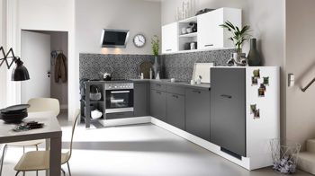 Die Fronten dieser pino Einbauküche sind vorrangig in Grafit designt, kombiniert mit puristischem Weiß. Auch die Korpusseiten und Sockelblenden präsentieren sich in Weiß. Ebenfalls weiße Arbeitsplatten mit grafitfarbenen Kanten sowie schwarze Bügelgriffe runden die modern-elegante Optik stilvoll ab.
