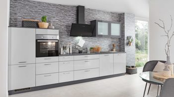 Da die ca. 375 cm lange Küchenzeile zahlreiche Schränke und Auszüge beherbergt, unter anderem die edlen Glashänger mit Milchglasfronten, die als echtes Highlight fungieren, steht Ihnen jede Menge Stauraum für Lebensmittel, Geschirr und andere Küchenutensilien zur Verfügung.