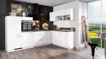 weiße Hochglanz-Lacklaminatfronten und schwarze Arbeitsplatten